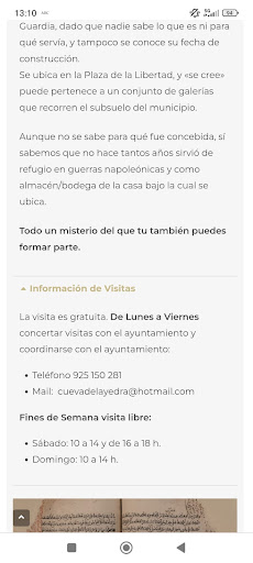 Read moreUn chasco y una tomadura de pelo. Acudimos el sábado 14 (según web oficial, abierto sin necesidad de cita previa), encontramos la puerta cerrada sin cartel explicativo o un número de teléfono operativo (llamamos al de la web y estaba apagado). Preguntamos en el estanco, vecinos por la calle y en unos de los bares de la plaza, donde los vecinos nos confirmas que debería estar abierto y muy amablemente (gracias a todos) se ponen a llamar a varias personas, incluido un concejal para ver lo ocurrido. Al final, y tras varias conversaciones la persona encargada de abrir se niega a hacerlo y a darnos explicaciones a la cara por lo que damos las gracias a los ciudadanos del pueblo que nos han ayudado y pensando en el tipo de turismo que queremos mostrar. Enhorabuena señor encargado, su educación y su profesionalidad son nulas y seguramente haya mucha gente que se desviva por mostrar el patrimonio sin esa desidia y esa falta de respeto. Esperamos que está queja tenga su altavoz para mejorar...