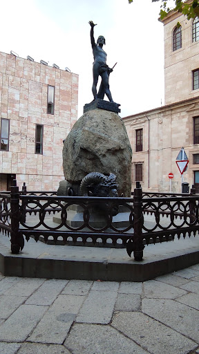 Preciosa escultura en una plaza del mismo nombre y con una historia detrás. En 1902 inicia Eduardo Barrón gestiones desde Madrid, para que la estatua sea concedida finalmente a la Diputación Provincial de Zamora y se convierta en un monumento público, en agradecimiento del pensionado que subvencionó la Diputación en Roma. Inicialmente la ciudad no mostró interés. Finalmente se eligió la plaza actual frente al Palacio de los Condes de Alba y Aliste. El pedestal de piedra granítica se trasladó desde las canteras de Arcillo empujada en dos piezas por un carro tirado por bueyes. El ariete que reposa en su parte inferior data de esta época en la que se instala en el medio de la plaza. Se colocó a finales del 1903, sin realizar apertura oficial, unos transeúntes que pasaban la descubrieron el 12 de enero de 1904.En 1971 se desplaza el monumento del centro de la plaza, y se coloca en una de sus esquinas. en su lugar se plantaron...