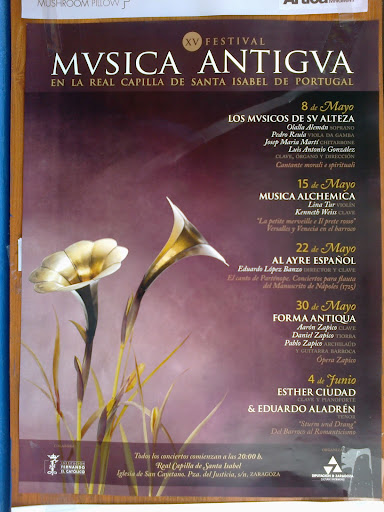 Read moreSituada en la plaza de San Cayetano, como se le llama popularmente, o del Justicia, la denominación oficial en la actualidad. La iglesia, propiedad de la Diputación Provincial de Zaragoza, es ahora oficialmente la Real Capilla de Santa Isabel de Portugal. El templo estuvo consagrado a los santos Cayetano de Thiene, Andrés Avelino e Isabel de Portugal. Desde hace unos cuantos años, en mayo - junio, se celebra un festival de música antigua. Los bancos son incómodos, conviene llevarse algo que haga de mullido. La acústica es mala. Pero los grupos y los programas son muy interesantes, y la entrada es gratuita. Eso sí, conviene acudir un poco antes de la hora de inicio para hacer cola y coger sitio. Es una excelente iniciativa para difundir y hacer accesible música de calidad. Es una plaza de mucho encanto, a lo que contribuye no poco la fuente de la Samaritana, su sonido y los juegos de la luz y las sombras que se filtran a través de las hojas de los árboles. La plaza tiene bancos para sentarse y es acogedora,...