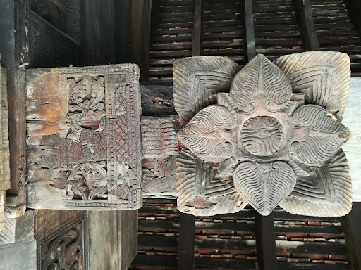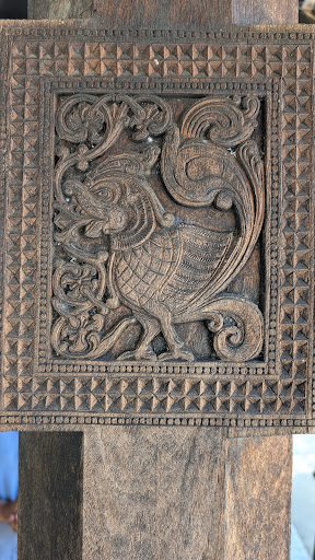 Embekka Devalaya in Sri Lanka: The Woodcraft Except the Sanctum the rest of the temple is made almost entirely of wood. From carved wooden pillars in the Halls which have open sides to the beautifully crafted roof, the entire are is covered in carvings. The bases of the pillars are octagonal in shape while their tops end in the shapes of a four leaves stacked in a square. The pillars have various images carved into the sides of the bases. In addition carvings adorn the beams, rafters and doorframes.