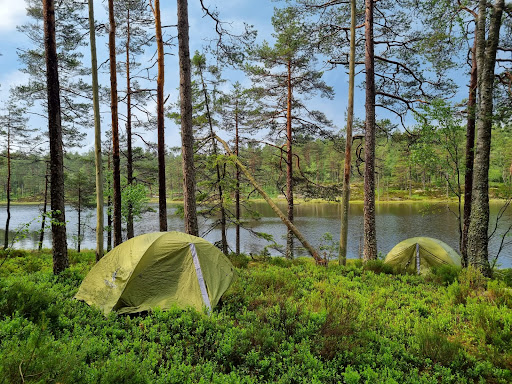 Fantastisk natur med tillhörande skog! Hit drog jag och sambon med två vänner för att leva i det vilda med tält. En naturupplevelse som skulle sträcka sig vida över det lilla man får hemma i Jönköping. Första stegen på leden var väldigt mysig med fina spänger och vackra vattendrag. När vi gått tillräckligt långt ifrån bilarna så det kändes som att vi var helt i det vilda så bestämde vi oss för att slå upp tälten. Detta var vid en sjö och läget var perfekt! Det dröjde dock inte mer än 5 minuter så började alla vifta och ha sig, knotten var ett faktum! Det visade sig vara parasiterna från helvetet och alla fyra såg ut att helt plötsligt vara på någon typ av gruppträning med friskis och svettis. Det viftades så vida pass att man ibland glömde bort vart man var någonstans. Vi viftades hela kvällen, natten och morgonen. Vi slängde snabbt upp tälten och blev sonika fångar i våra små tygskynken med fyra väggar. Dagen därpå fick vi först avleda knotten en slinga i skogen för att snabbt som bara den springa tillbaka och packa ihop tälten och fortsätta vandringen. Forsättningen på vandringen dagen efter var magisk och våra förstörda kroppar glömde tillfälligt bort misären dagen innan. Vi hittade flera fina ställen att hänga på längs sjöarna, som säkert hade varit ett bättre val att sova på än sumpmarken vi valde dagen innan. Här fick vi ro att tillaga lunch och till skillnad från gårdagens beslut att kanske kasta ihop maten och skrikäta den som fyra grottmänniskor så kunde vi njuta och laga av maten i total frid. Fortsättningen av dagens vandring blev än mer magisk och vägde på något konstigt sätt upp gårdagens totala kaos.