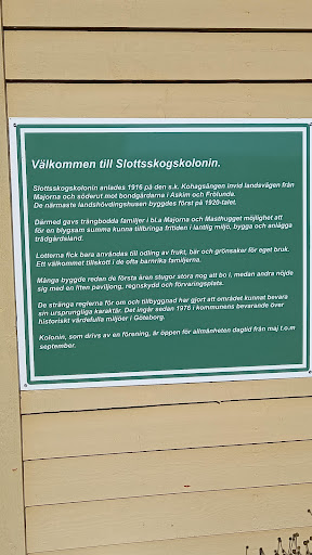 Read moreÄr född alldeles intill Slotts skogs kolonien , och innan Den blev till, hade min Morfar en liten stuga på Söderling Ängen framför Nuvarande S.- kolonien .,. Mysig kultur bevarad i Majorna. Kallades ibland av Maj bor , Kungsladugård kolonien i och med sin närhet till Distriktet....Roligt Att intresset lever vidare hos folk i denna grönskande och lummiga Koloni , där inget hus är det Andra...