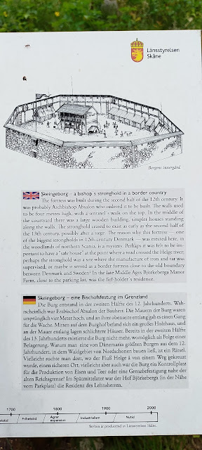 Skeingeborg byggdes som ett centrum i det dåvarande ärkebiskopslänet Björkeberga län troligen med ärkebiskop Absalon som byggherre. Genom en handling från 1100-talets mitt vet vi att Björkeberga län hade donerats till Lunds domkyrka. Länet omfattade i stort sett nuvarande Verums socken. Arkeologiska undersökningar har visat, att Skeingeborg uppfördes under 1100-talets andra hälft. Murarna var ursprungligen 5 meter höga och hade en väktargång på krönets insida. Mitt på borggården låg ett stort trähus och längs murarna fanns enklare hus. Läget på borgön gjorde borgen lätt att försvara. Borgen upphörde att existera redan under 1200-talets andra hälft. Den har inte beskjutits eller bränts men är nedriven, kanske tvingade en belägring borgherren att ge upp. Borgen var en av Danmarks största 1100-talsborgar och den mest regelbundet byggda. Varför man byggde denna ”praktborg” i norra Skånes skogsland är ännu en gåta. En anledning kan ha varit att man sökte en trygg plats där den farbara Helgeån korsades av en väg. Kanske var borgen en kontrollplats för produktionen av järn och tjära eller var den en gränsfästning invid den gamla riksgränsen? Borgen var okänd fram till 1924 då landsfiskal Fluhr i Vittsjö i ett brev till riksantikvarien berättade om borgen. Källa: Länsstyrelsen Skåne.Vid utgrävningarna under åren 1949-50 på-träffades bl.a. medeltida detaljfynd bestående av bultlås, ryktskrapa av järn, fragment av sporre och ring.I hörnet mellan östra och nordöstra murarna fann man två små speltärningar, tio mynt, tre mynt med präglat namn Waldemar, ett med biskopsbild med namn Andreas Sunesen, en liten hammare, en lång smalryggad kniv, en led av ett grovt gång-järn, järnspik och flinta. Intill ena muren troligen rester från husbyggnad, skärvor, kalk och bränd lera. I rasmassorna påträffades djurben av svin, nötdjur, fågel och fisk.Att Borgön även har varit boplats under stenåldern ger ett stort antal fynd belägg för. Bland annat har påträffats 12.000 flintor varav 550 kan hänföras till stenåldersredskap, en grönstensyxa och ett femtiotal...