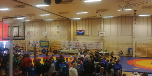 I idrottshall: Läktare 2 stora mål Förvaringsutrymme med idrottsredskap