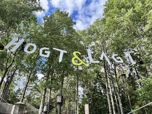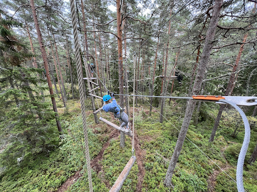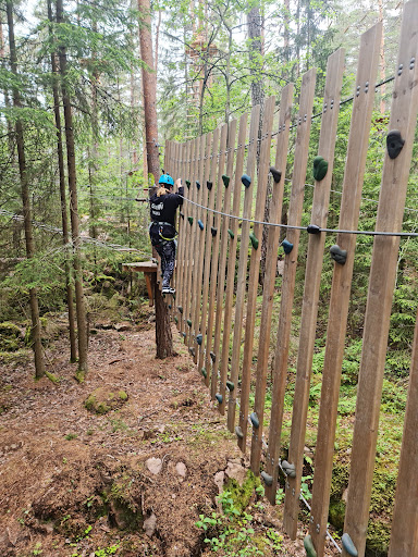 There are courses that are easy (green), easy-medium (dark green), medium (blue) and difficult (red). You must be 110 cm to climb but there are also other stuff to do if you don't want to or can't climb. The medium course requires 140 cm or that you can haul your own weight. To try out the red - most difficult - course you need to be at least 150 cm. I would personally like to add that you need to be quite agile and strong as well as this course is... Tough!