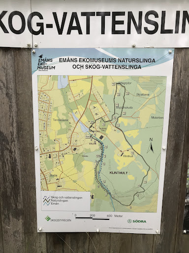 Naturlehrpfad (ca. 3 km Rundweg) Der markierte Weg führt teils am Ufer des Emån entlang und durch abwechslungsreiche Wald- und Feuchtflächen. Unterwegs haben wir reichlich Blaubeeren und Himbeeren am Wegesrand naschen können, es finden sich aber auch Sanddorn und Preiselbeeren. Die Infotafeln sind zwar etwas in die Jahre gekommen, bieten aber nach wie vor gute Einblicke in heimische Flora und Fauna.