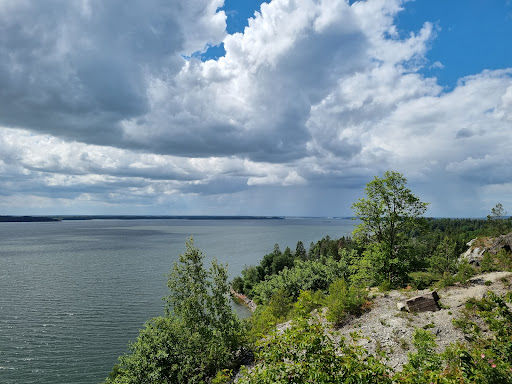 Följer man den orangea leden kommer man till ett vindskydd med vidunderlig utsikt över Bråviken. Inte speciellt barnvänligt eftersom det ligger högt uppe på klippan. Men har man koll på barnen går det bra att grilla och stanna med dem där. Vindskyddet rymmer 4 personer och det är populärt. Vill du sova över gäller det att vara ute i god tid. Ingen toalett finns. Du behöver gräva ner det du lämnar efter dig. Toalettpapper är ingen trevlig syn i naturen. Nattetid kommer gärna små skogsmöss och knaprar på matrester. Vi hade all mat nerpackad men lämnade en hermetiskt tillsluten nötpåse vid huvudkudden. Två modiga möss kom nattetid och knaprade hål på påsen. Trots att vi viftade iväg dem dröjde det inte mer än 5 minuter så var de tillbaka och kilade förbi huvudkudden. Förvara all mat...