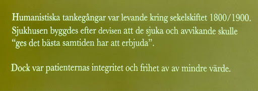 Read moreIntressant museum och en spegel både av olika tidsepoker och människosyn. Var förvånad över den varma människosyn som skulle prägla mentalvården: ”de skulle ges det bästa samtiden har att erbjuda” och ligger nära skog och sjö. Sedan kanske inte vården alltid präglades av detta. Stor skillnad mot människosynen på de institutioner som bl a återfanns i östra Europa vid...