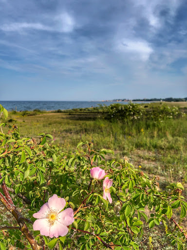 Beach (at where dogs are allowed) with very cool looking cliffs. It becomes quite deep after just a couple of meters, so parents should keep an eye on their smaller kids (which they always should around water!). The sand is a bit more rough than at the other nearby beaches, it's brown (much like brown sugar) and might therefore become quite hot on...