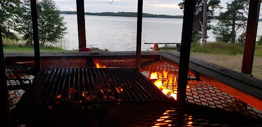 Jättemysig eldstad med sittplatser runtom, riktigt schysst att kommunen tillhandahåller gratis ved att elda med också, lådan med veden i var välfylld och låg torrt. Det finns till och med två mulltoaletter som var relativt fräscha, ena är för människor med rörelsevariationer, dock en kant på ~20 cm att ta sig upp för, men gott om toapapper och handsprit när la är klar. Det är också tak över bänkarna runt eldstaden, så man har ett visst regnskydd.