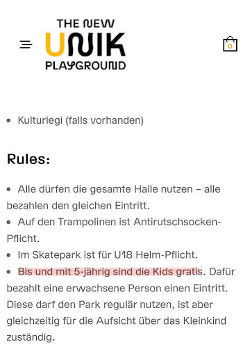 Read moreAbsolute Abzocke. Unverschämte Preise. Stickige kleine Halle mit wenigenTrampolinen. Sehr viele juengere Kinder die kreuz und quer unbeaufsichtigt durch die Halle laufen. Rutschfeste Socken zum Leihen( ?!?!) 3CHF. Kauf 5CHF. Für diesen Preis gabs dann nur Socken in Orange/Lila... wenn nur eine Farbe angeboten wird, dann bitte eine neutral Farbe. Als Begleitperson musste ich 3CHF zahlen, dafuer habe ich einen Verzehrbon erhalten. Allerdings brachte mich dieser Verzehrbon nicht weit, da die Preise fuer Getraenke auch gesalzen sind. Sitzplatz gabs auch keinen mehr da sich Familien ueber 3 Tische ausbreiteten. Das ganze hat uns (2 Jungs und eine Begleitperson) fuer eine Stunde 41CHF gekostet. Im Bouncelab in Belp bekommt man fuer sein Geld weitaus mehr geboten, vom Service ein Lächeln und von den Trainern auch einen Tip wie man seine Salti verbessert. Nichts davon im Unik. Nicht zu empfehlen.