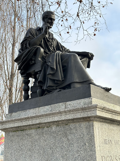 Statue of Rousseau, seating on a chair, writing a letter. The text in the book in his hand is: "emile si la vie et la mort de Socrate sont d'un sage, la vie et la mort de Jesus sont d'un Dieu." (If the life and death of Socrates are those of a wise man, the life and death of Jesus are those of a God), a quote from Rousseau's Émile ou De l'éducation...