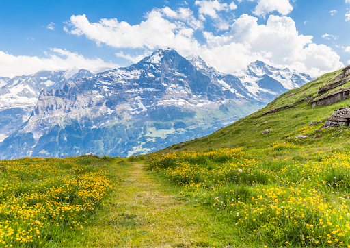 As you hike along the trail, you'll be treated to breathtaking views of the Eiger's towering north face, which rises to heights of over 1,800 meters above the valley floor. Along the way, you'll also enjoy panoramic vistas of the surrounding peaks, including the Mönch...