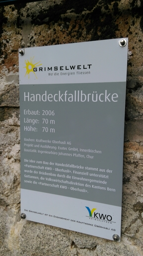 The Handeckfall bridge was built in 2006, 70m Length, 70m Hight. It connects hotel Handeck with the bottom station of the Gelmerbahn funicular and crosses over the Handeggfall. After crossing the suspension bridge and enjoying the looks of the Handeggfall you can take the Gelmerbahn up, to lake Gelmersee. (Bridge -...