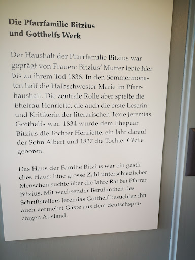 Read moreWer Informationen über den Pfarrer Albert Bitzius, alias Jeremias Gotthelf, sucht, der wird im Gotthelf Zentrum in Lützelflüh bestimmt fündig. Sehr einladend gestaltetes Museum mit unzähligen Dokumenten des berühmten Dichters und Schriftstellers. Auch für "Museums-Muffel" geeignet, da in diverse Werke auch in Form von Hörspielen bzw. Filmsequenzen Einblick gewährt wird. Hier lässt sich...