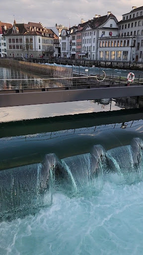 History: The bridge was originally constructed in the 13th century to connect the "Mühlenplatz" or "Mill Place" on the right bank of the river Reuss with the mills that were in the middle of the river. The mills took advantage of their location to harness the hydropower provided by the river. The bridge was later extended to the left bank in the early 15th century connecting both sides of the river however, the bridge was then destroyed by a flood in 1566 and was subsequently rebuilt. The mills that were in the middle of the river burnt down in 1875 and it was decided to not rebuild the mills in favour of a power plant on the site in 1887/89. This power plant supplied the city with electricity until 1977. One of the turbines can still be seen at the site of the old power plant today. The concrete structures are also still visible and are still being used to direct the flow of water.