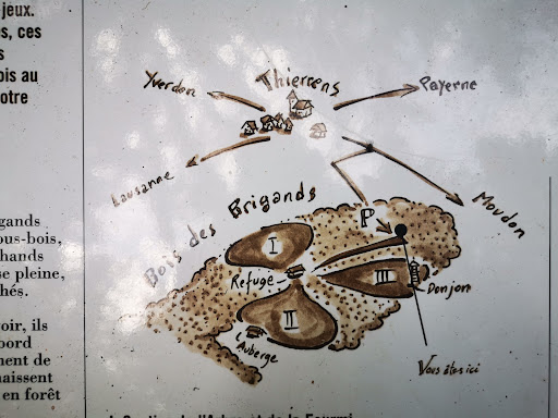 Le donjon du Bois des Brigands Ă Thierrens, est situĂ© au bord de la forĂȘt. Il a quatre Ă©tages, avec un escalier central.