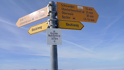 Schöne Wanderung vom Neckertal hinauf zur Burg Neu Toggenburg (1084 m.ĂŒ.M.). Es bietet sich einem eine schöne Aussicht ĂŒber die Berge des Neckertales (St.Gallen) und in Richtung Thurtal . Der Blick zu den Alpen ist nur wenig möglich da die SĂŒdrichtung sehr stark mit BĂŒschen zugewachsen ist. Der direkte Anstieg vom Weiler Schwanden ist etwas steil und beschwerlich (zumindest fĂŒr schlechte Wanderer). Besser ist ein Anstieg ĂŒber den Weiler Graben. Optimal ist natĂŒrlich der komplette Rundgang da man so die schöne Landschaft um die Ruine herum am besten genieĂen kann. Die Ruine selbst besteht nur noch aus den Mauern und einem Fensterbogen. Die alten BurggrĂ€ben sind noch gut erkennbar. Am höchsten Punkt befindet sich ein Grillplatz mit Tisch und mehreren BĂ€nken. Eine Infotafel und ein Wegweiser zu den Wanderwegen ist ebenfalls vorhanden. In den Hangwiesen um die Burg herum befinden sich teils seltene Pflanzen. Auch viele schöne Schmetterlinge tanzen hier um den...