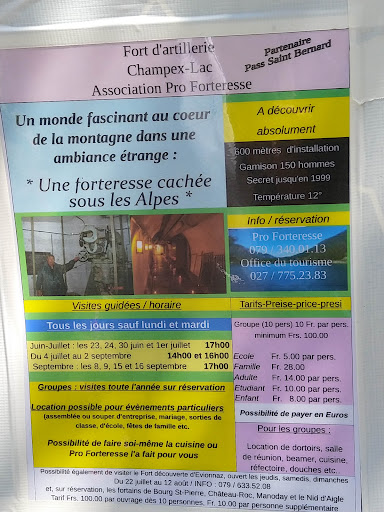 Read moreAujourd'hui, j'ai eu l'occasion de visiter le fort d'artillerie de Champex-Lac. Le guide était très gentil et il nous a expliqué l'histoire et le fonctionnement du fort en détail. Pour des touristes américains, il a même résumé ses explications en anglais. Moi, je suis alémanique, mais parce que je maîtrise le français ainsi que l'anglais, j'ai compris le guide sans problèmes. À l'intérieur du fort, il fait assez frais, donc il faut porter un pull ou une veste pendant la visite qui dure environ 90 minutes. Le fort d'artillerie de Champex-Lac est un monument historique situé dans une très belle région et vaut la peine en tout cas. La visite du fort se combine très bien avec un tour du lac de Champex ou une visite du jardin alpin Flore-Alpe. Champex-Lac est à bon droit surnommé "le petit Canada de la Suisse" et il est un des plus beaux villages de la...