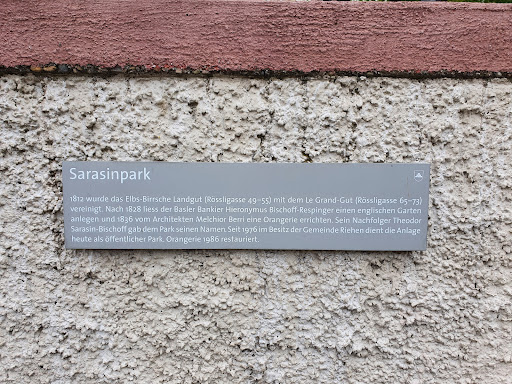 Mit alten Bäumen, Ententeich, Spielplatz, Bänken & WC geht die schöne öffentliche Grünanlage seit 1976 in Riehen zurück auf 1812: damals wurden 2 Grundstücke vereint. 1836 ließ ein Basler Bankier hier einen englischen Garten anlegen, 1836 kam eine Orangerie dazu (heute restauriert). Sein Nachfolger Sarasin-Bischoff gab dem Park seinen Namen. Der Park liegt an der Tram-Haltestelle (Tram 6, Fondation Beyeler). Die Fondation liegt...