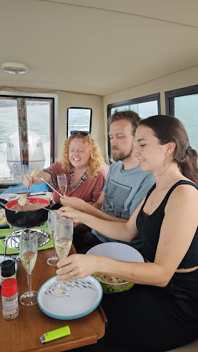 Read moreWir hatten ein Fondue an Board und es war super! Es hatte zu Beginn stark geregnet, deshalb mussten wir zuerst im Hafen warten (das Wetter kann man halt nicht beeinflussen..). Das Wetter wurde aber genau getrackt und so konnten wir kurz darauf losfahren. Wir fuhren Richtung schönes Wetter und landeten so in der Stadt Zürich und in der Limmat. Die 2 Skipper Lukas und Corinne hatten uns auch vieles über die Stadt, die Gebäude und über den Zürichsee erzählt. Ein wirklich tolles Erlebniss, würde ich sofort wieder machen - vielleicht nächstes mal mit Raclette am...