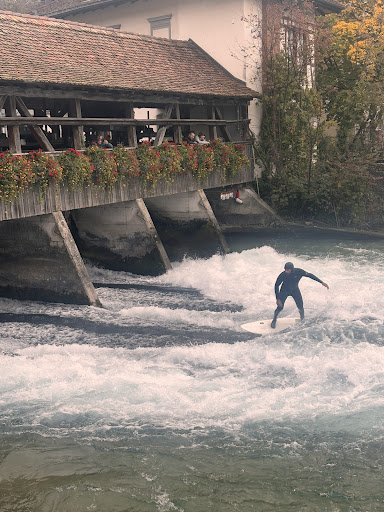 Wer in Thun nur durch die Altstadt spaziert — dem entgeht ein kleines Wasser-Abenteuer direkt im Stadtkern: an der Mühleschleuse haben wir beim Flanieren plötzlich Surfer entdeckt, die in der kraftvollen Welle der Aare zwischen historischen Mauern ihre Moves zeigten. ⛵🏄♂️