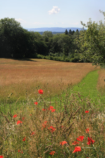 Machen wir uns auf, auf den Abstieg. Aber nicht auf dem selben Weg zurück. NEIN, der schmale Weg ins Tal MUSS es sein. Ich schwärme nicht weiter, jeder muss für sich seine Eindrücke erleben. Wir queren an der Straße die Wiese, und gehend nachdenkend über des Erlebte den neu gestalteten Wanderweg (der bald bis Jestetten führt) zum Parkplatz zurück. Ja, auch von hier aus gibt es so viele schöne Wanderungen. Einfach mal ungezwungen sich die Zeit dazu nehmen. Hier gibt es so viele wunderbare MTB Möglichkeiten! Es soll sogar MTB-Fahrer geben, die sich trauen, den Rest des Weges ab der Ruine ins Tal zu machen. Es gibt Zeiten, da muss man den Weg aber auch "sehen". Ich habe es gewagt, lasse es aber. Habe nach 50 m aufgegeben. Wollte es unter der Woche einmal probieren. Ich traue mir es nicht zu - nicht nur aus Respekt Wanderern gegenüber: auch aus Sorge um mein Bike :-) Ich liebe auch MTB fahren, aber gerade aus Respekt: BITTE NICHT. Besser nur mit dem besten Freund und achtsam gegenüber anderen. Auf festen Wegen. Sogar meine fast 84 jährige Mutti hat gekämpft, und war zutiefst bewegt....