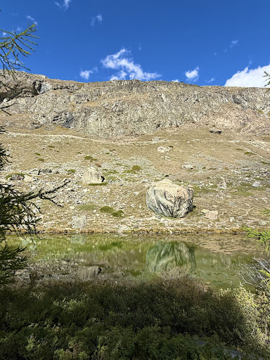 Grindjesee is the second lake on the 5 Lakes Hike (5-Seenweg) from Blauherd, following Stellisee. Tucked away slightly off the main gravel trail, this lake feels quieter and more secluded, making it a favorite for those who want a peaceful stop surrounded by larch forests and wildflowers.