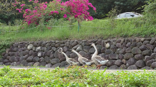 來的時間是平常日,快到中午,在入口處剛好有一人騎機車離開,可能是園區的人吧!一進入就能感受到一個難得的寧靜空間,先走一小段上坡,在左邊有一間設備齊全的化妝室,化妝室的前面有一個池塘,有幾隻大鵝在池邊漫步,沿著步道有一些青蛙的雕像,步道的終點有一個圓形的木製平台,再往上就接回由入口上來的道路。
