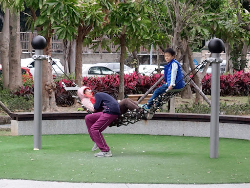 Read more榮華公園距捷運明德站步行約7-10分鐘。 榮華公園的遊具組結合了多樣的攀爬方式,讓孩童在此能有多種方式的攀爬體驗。 輪椅族可入內的旋轉盤不易推動,實際使用上也較安全。 札實穩固的吊床躺上去在此小憩片刻好悠然。 往榮華一路7巷方向前進可以玩立式及坐式溜索,一旁有設計可轉動、迷宮、照鏡子遊戲板。 公園內沒有廁所,鄰近雖然有一間廟宇但我不好意思去使用。 到鄰近步行約5分鐘的榮富公園有一處廁所才方解手。