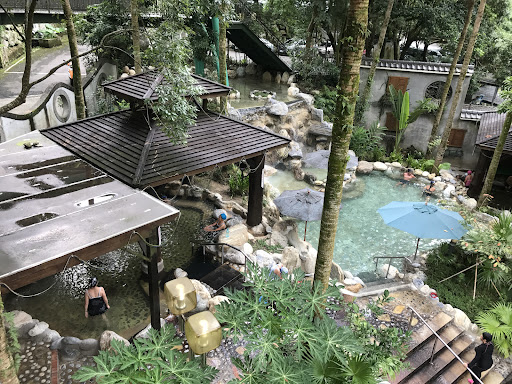 狹長型環境,入口那區有三池,分別:SPA池38度左右、40度、43-44度。這三池算大,也是主要可泡的池子。入口右手邊有一台桶裝式飲水機(離開時發現空了沒人更換)。還有一個蒸氣室,大約可容納5-6人,男女共用的。沒有烤箱。園區中段大多休憩座位區跟造景(是不能下水的冷水造景池)。有一個有溜滑梯的兒童池(可惜是冷水沒人玩)。後段也有一大區休憩躺椅區(但感覺欠缺維護)。另有一座高低造景石牆,裡面有3-4個小池,僅容納1-2人那種大小,水溫偏低。