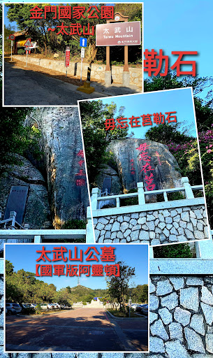 金門國家公園太武山海拔253公尺,地處金門島嶼的正中央,戰役史蹟豐富,是八二三砲戰重要的紀念地,可鳥瞰金門田野風光,沿著好漢坡至「毋忘在莒」勒石,高有數十丈,先總統蔣中正的墨寶印刻而成,為金門最著名的地標,設有「太武山公墓」,國軍版的阿靈頓公園。