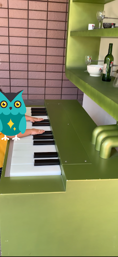 The green piano was really cool, when pressing the keys, it plays the glasses on the wall.