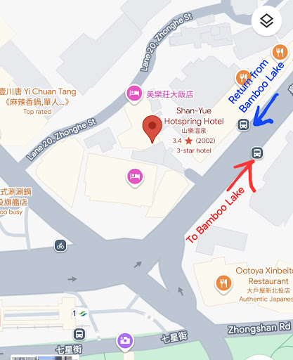 We stayed near XinBeitou. Move to QuanYuan Road where I marked with a red arrow, there is a bus stop (Xinbeitou) that has a service S9 小9 Beitou Zhizihu Shuttle Bus which will lead you all the way to the destination, Bamboo Lake, which is also the last stop. After visiting Bamboo Lake, you just need to come back to the same bus stop where you alight to take the same bus back to XinBeiTou (see the blue arrow). There are two S9 service, there is another one which serves a shorter route.