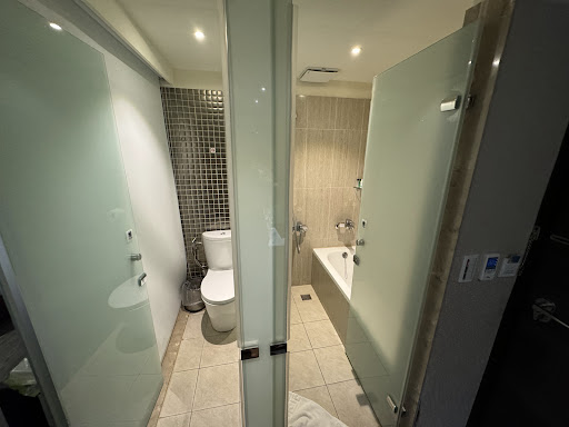We stayed here for 2 nights on the 6th floor. The room itself was clean and modern, but the bathroom had urine stains on the back of the toilet where the seats lift up. ||||The bathroom was a bit weird as I think the glass separating the shower & bathtub from the toilet was missing. The shower head is to the right of the bathtub with a small walkway space big enough for a stand shower, however since the glass was missing the water splashed all over the floor. We even aimed the shower head at the bathtub as you stood in there, but water still got all over the floor and you had to use your towel afterwards to mop up the floor.||||Walls are pretty thin, you can hear other guests as they leave or are talking in the hallway to the elevator..rooms are also not that far from the elevators. 8 rooms per floor, 2 rooms on each corner of the elevator. You can even hear the other guests taping up boxes with packing tape in the room next door, quite the annoying sound to wake up to @ 7:30AM.||||Beds were comfortable and pillows were soft, sheets were clean and smelled fresh. The sink was in the bedroom, it was a weird set up. Breakfast was included with our stay from 7:30-9:45AM (not a western style breakfast except for eggs & toast).||||Hotel was right across the street from the MRT station, so very easy to get to and from when you...