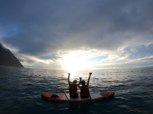 參加8.31清水斷崖SUP日出團 報名一人一板1,兩人一板1 耐茁的教練都超幽默又專業(外加帥氣哈哈) 我們這團11人就出動了3位教練,因此都能及時照顧! 媽媽已要60歲平時有爬山習慣,因為不會游泳因此跟她兩人一板,順利出海後她也逐漸習慣,最後教練還超貼心的多拿一個板子給我玩,最後我們變成三人三板!超驚喜!