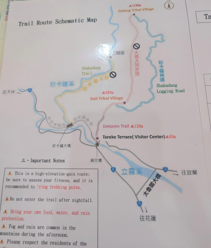 Read moreThis review is not so much for the park itself which looks like it is gorgeous but for the experience you can currently have if you are traveling by public transportation (this was July 2025). Unfortunately the 2024 earthquake caused huge landslides and damage to the park. We knew this but had trouble finding detailed information about what we could see if we went anyway. We took the bus to the Taroko Gorge Visitors Center which was open and had very helpful staff. Right now, there is one trail open, a steep path to Datong Tribal Village (attached a photo of the map.) You are also allowed to walk the road into the gorge at the times that vehicles are allowed in. This is what we opted to do (second photo attached). We walked about 2 km along the road and through tunnels and did get some nice views. But there is no shoulder so with buses and cars passing it was not the best walking. But it was just a taste! We look forward to being able to see...