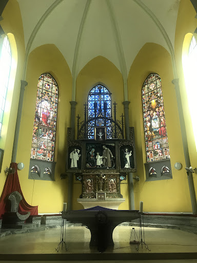 It has gorgeous stained glass windows across the sides and behind the altar, which in itself is remarkable... and quite a sight especially when the late afternoon/evening sun shines through. Within it's tall steeple/bell tower is a still-functional bell. During the Sunday masses, there are beautiful choirs singing at each Kiswahili or English masses.