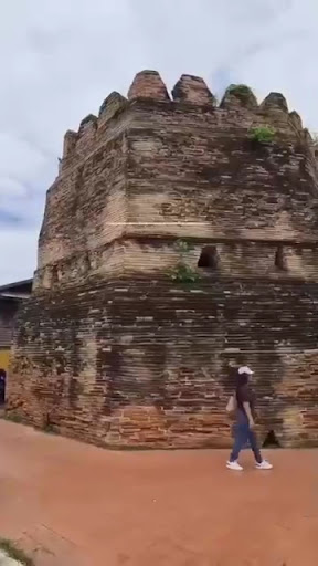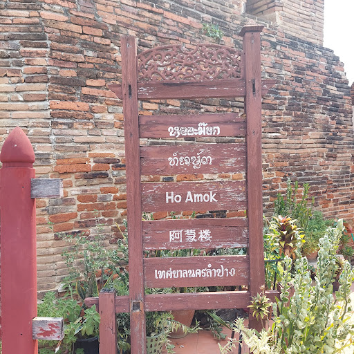 Copied from the info board at the tower: "The word " Amok derived from a Burmese word which means "a turret." It is an ancient turret built in 1808 in the reign of Chao Hawkhum Duangtip, the 3 King of Lampans of the Thip Chakarawongse Sattaracha Dynasty Amok Tower is a huge building with an octagonal shape similar to a horseshoe with in an oval shape. It was made of clay brick construction to protect against enemy attack. The turret is located inside the city wall Its area is 13 meters wide and 17 meters long and has a height of about 10.25 meter. The foundation of the turret cascades in a descending order. The spire of the front turret is 1.50 meter high. The highest peak of the turret wall is shaped to make three battlements of 1.50 meter wide and 1 meter thick. The sole entrance and exit is to the west of the turret which is located inside of the city wal To the left and the right of the entrance (it is also the exit) is where two terrific-looking cannons have been installed (by Ajarn Saksern Ratanachai sometime afterward). Inside the turret there are the three-storied wooden scaffolds. These scaffolds were used to lift the cannons, cannonballs and gunpowder into the battlements. There are triangular holes where the cannons would be placed with their muzzle...