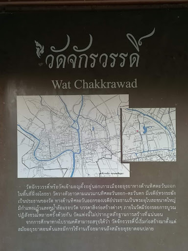 Wat Chakrawat ( homonym with â Wat Chakrawat â or so-called âCrocodile Temple â in China Town , Bangkok )or Wat Chao Mon is located off the city island ,on the eastern area in Tambon Hantra, Amphoe Phra Nakhon Sri Ayutthaya, where formerly was located on west bank of Klong ( canal) Ayodhya,many temples nearby were Wat Kudi Dao on the south, Wat Ayodhya on the north and Wat Pradu Songtham on the west.In A.D. 850 , during the time of â Ayodhya â Khmer used to be here, occupied and built a stronghold in this area, Wat Chakrawat might had been established before A.D.1351, subsequently this temple was abandoned because Krung Sri Ayutthaya fell to Burmese in B.E. 2319(A.D. 1767), later on the Fine Art Department take responsibilities in B.E. 2542-2544( A.D. 1999-2001). With medium size as this temple was, the front side face east, 3 ditches surrounded ( east side excluded), 1 Principal Chedi (23 smaller Chedi), 1 Ubosot and 3 layers walls. Ubosot stayed on base with the size of 16 m. width and 30 m. length,2 doors on east and west direction .Huge Chedi with the size of 26 m. height, located on the 22 m.square base.Viharn was located on the northeast of Ubosot , remained only rectangular base of the size 10 m. width and 18 m. length.Wat Chakrawat was started establishing during early Ayutthaya era , major restoration were done on late...