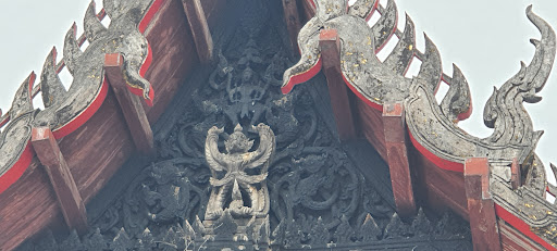 หลังคามุงกระเบื้องไม้สัก หน้าบันสลักภาพ พระนารายณ์ทรงครุฑ (ซึ่งปัจจุบันครุฑบางส่วนหายไป)