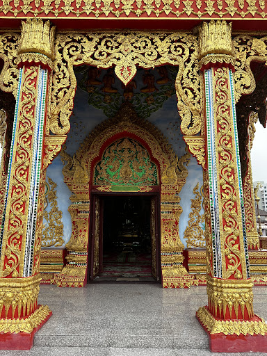 The main hall of the temple is compact and located near the entrance. It has a smaller area compared to a basketball court. Inside the hall, you will find a Buddha statue in a popular posture known as "มารวิชัย" or "overcoming evil." The elevated perimeter of the hall is adorned with marble and is meticulously maintained, giving it a clean and well-kept appearance.
