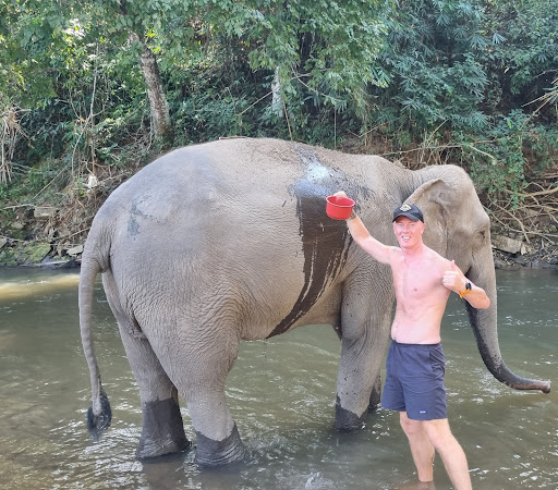 My wife and I lucked out during a visit to Chaing Mai. While stopping to take photos of a local Wat (temple), we met a friendly Thai man visiting with his family from Bangkok. He told us he had been to the Chiang Mai Elephant Home the previous day and highly recommended it. He showed us where in Chiang Mai to book it (as some of the tourist traps book you in one location and then send you somewhere different). We were looking for a Sanctuary that did not encourage riding of elephants. Booking was easy and straightforward. My wife and I chose the full day plus hike option. We were picked up from our hotel at 8am by Ronnie, and driven out to the countryside in the back of a pickup truck (standard method of transportation for Chiang Mai). Along the way we stopped at a country market for a washroom break, snacks, and refreshments (get a Thai style iced coffee...very decadent!). The entire trip took about 75 minutes to our first stop, which was a bamboo rafting trip down a gentle river. Ronnie passed us off to a local river guide, and we took a leisurely 45 minute trip down the river. The river was calm with only a few small rapids...nothing to worry over but you will get a bit wet so a bathing suit is ideal for the ride. Plenty to see on the river as well...elephants, cows, oxen, snakes (tiny and harmless). After the river excursion, we met up again with Ronnie, who gave us the option of hiking to a waterfall OR a white sand beach. He recommended the waterfall, which was a shorter and easier hike, so we followed along. The hike was pleasant, not challenging for someone who frequently walks, and Ronnie regaled us with stories of elephants, his home life, and Thai traditions. After an hour or so, we arrived at the waterfall (very picturesque and romantic for this honeymooning couple), and we had 45 minutes to swim and explore. After that, it was another 30 minute walk through beautiful hilly countryside to the elephant home. Immediately on arriving we were seated to a nice Thai lunch...rice, curry potatoes and chicken, eggs and fruit. Once lunch was done, we changed into the provided elephant clothes (colorful and a bit ridiculous...but cute nonetheless), and were sent over to the food prep area. Ronnie explained to us what the elephants ate while we prepared food balls wrapped in banana leaves. My wife and I lucked out in our choice of program, because it ended up being only the two of us. Because of this, Ronnie was able to get us some extra alone time with 5 very hungry elephants (3 adults and 2 wee ones) who were more than happy to be fed, talked to, and petted. There were other groups of 10 people, but because they had chosen half day programs, we were able to get in with the elephants earlier. Ronnie was able to tell us about each elephant, their histories, and how they differed in personalities. Once the feeding was done, we switched back into our swim suits for some elephant bathing. A gentle big guy let us slather him in mud, and then took us down to the river where we were able to wash him off with big buckets of water. All the while Ronnie and the other handlers were there to make sure everything went smoothly. We opted for a photo / video option for an additional 550 Baht and were given a USB stick with everything on it before we left...a nice way to relive the memories whenever we want. At the end of the day Ronnie drove us back to our hotel and provided us with some recommendations of what we should see during our remaining time in Chiang Mai. Overall, it was a great day and we would highly recommend it to anyone looking for a cruelty-free experience with elephants. Ronnie was an excellent guide as well, so ask for him if you...
