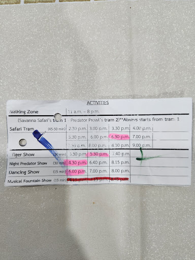 4- 5 pm Jaguar trail walking zone 5.20 Night predator show (night predator building outside of the entrance) 6 pm Tiger show at Tiger world 6.50 Pm English safari tram - 1 hr 8 pm dance show - open space just past the entry 8.10 Musical Fountain water screen- middle of Swan lake