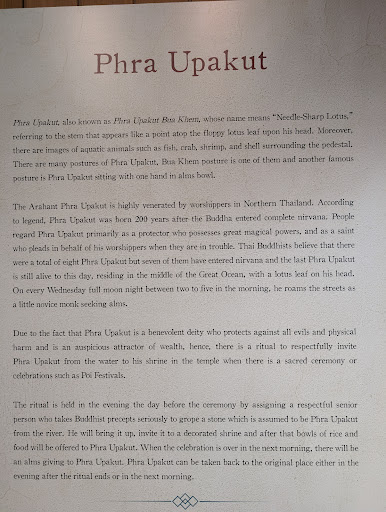 "He was an arhat who was praised by the Buddha for his magical powers. Before the Buddha entered Nirvana, he asked Phra Upakhut to remain alive until the coming of the Maitreya, the future Buddha. Buddha asked him to protect the Buddhist religion and the teachings of the Dhamma."