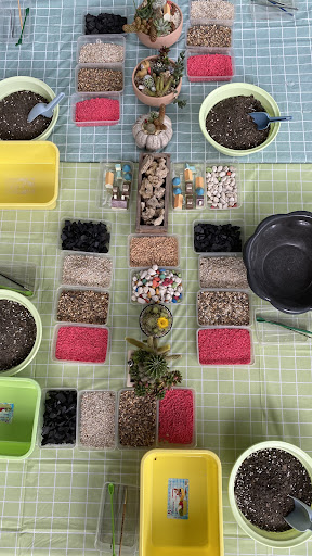 พี่ๆ ใจดีให้เลือกกระถางลายสวย 🪴 แล้วสอนเลือกกระบองเพชรที่เราชอบ 🌵 เทดินใส่ เอาแคคตัสมาจัดวางให้สวยงาม ประดับด้วยตุ๊กตาดินเผาน่ารักๆ โรยหินสีตกแต่งตามใจ