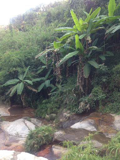 Duck under a large vine and turn right up hill until you come to an eroded embankment with a small river in a gully. This area has denser forest, bamboo trees and is more jungly than anything previously.
