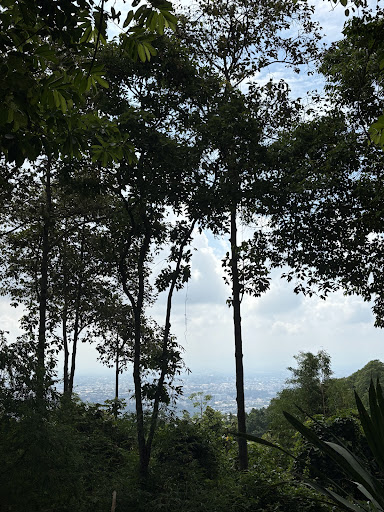 You'll cross a dry stream on a board and head upwards through dry forest on a scree trail for the first 800 metres. At that point you'll have a view of the city through the trees. Continue on and you will hear a river to your right, then the trail makes a left turn and levels off as you head into denser forest.