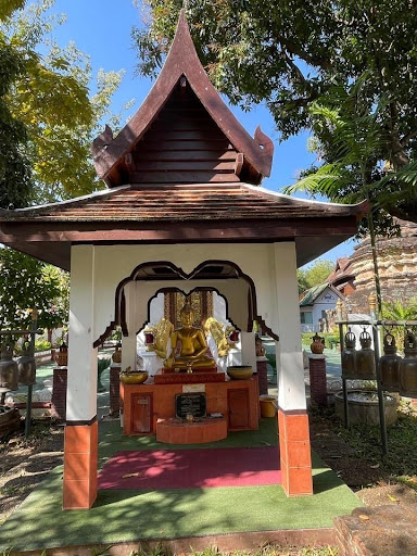 The stairway at the front of the hall is flanked by two stucco lions. The principal stupa is a Lanna-style bell-shaped stupa, located to the west of the assembly hall.