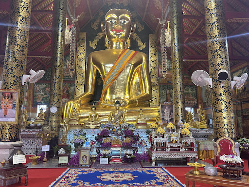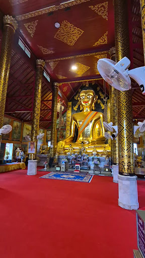 The temple, built in 1844 and completed in 1944, boasts classic Lanna architecture with striking red and gold hues. The main hall houses a massive golden Buddha statue with a warm, welcoming expression, surrounded by colorful murals depicting Buddhist stories. We were captivated by the intricate floral decorations on the veranda and the astrological fresco on the ceiling, adding a unique charm. The white chedi with seven golden arrows (Jed Yod means “seven peaks”) behind the main building is a standout feature, reminiscent of the Mahabodhi Temple in India. The grounds are well-maintained, with statues of nagas and a tiger adding to the cultural allure. While not as flashy as other temples, Wat Jed Yod’s simplicity and authenticity make it special. It’s free to enter, though we left a small donation. I recommend visiting early and pairing it with a stroll to nearby Mama French Bakery for pastries. A must-see for a quiet, cultural stop...